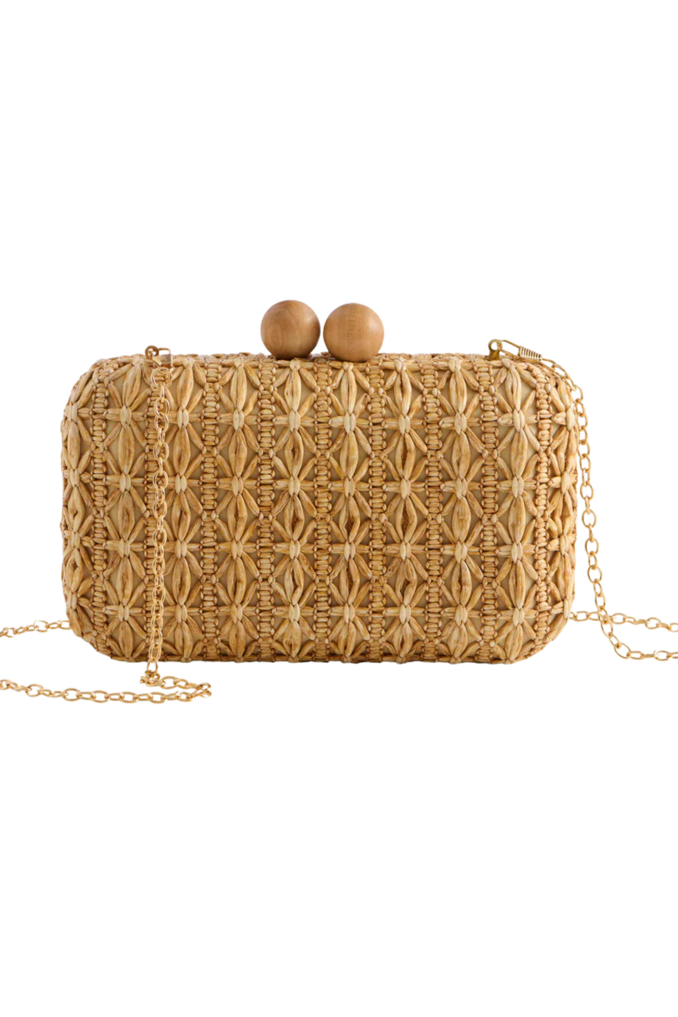 The Sydney Minaudière is your go-to statement clutch for summer soirées and tropical escapes alike. Featuring an intricately woven exterior and a playful wooden bead clasp, this compact bag blends vintage charm with modern flair. It opens with a magnetic frame closure and includes a detachable cross-body chain for versatile styling. Whether you’re hands-free at brunch or dressed up for dinner, this minaudière adds a polished pop to every outfit.