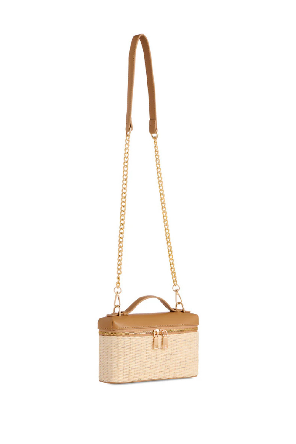 The Riley Shoulder Bag is a stylish blend of texture and shine, featuring a structured woven body and sleek faux leather trim. Designed with a single top handle and a detachable gold chain strap, it gives you the option to wear it as a shoulder bag or crossbody. A top zip closure keeps your essentials secure, while an inner slip pocket adds a touch of practical storage. Compact yet eye-catching, the Riley is perfect for sunny outings, weekend brunches, or wherever your day takes you.