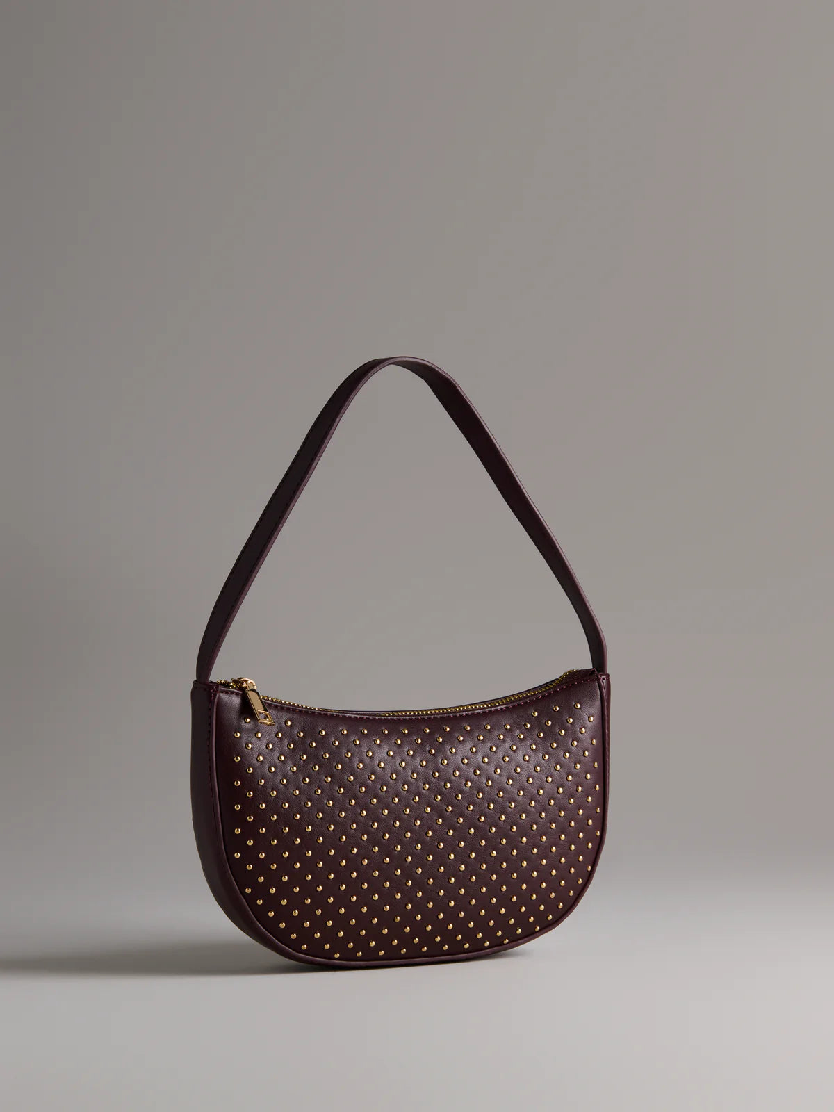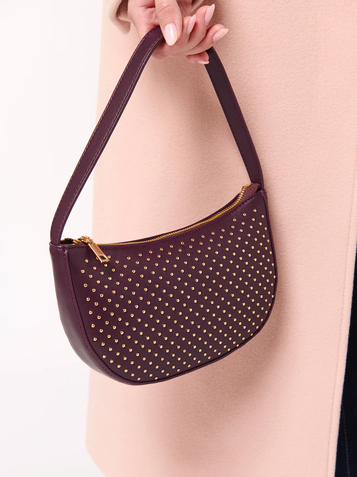 Add a little sparkle to your everyday look with the Roxy Shoulder Bag. This sleek faux leather shoulder bag features an arched silhouette covered in petite, polished studs for just the right amount of edge. With a top zip closure, inner zip pocket, and two slip pockets, it keeps your essentials organized and secure. Compact and chic, it’s perfect for nights out, brunch dates, or anytime you want your outfit to shine.
