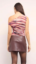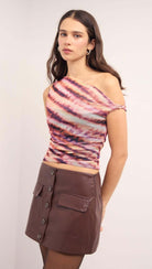 The Liv Pink & Purple Striped Mesh Top brings a bold twist to everyday styling with its abstract blurred stripe print in vibrant pink and purple tones. Designed with an asymmetric one-shoulder cut and flattering ruched sides, this mesh top is a statement piece that can be dressed up with a mini skirt or styled casually with denim.