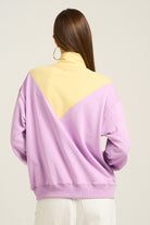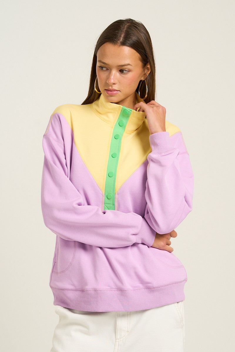 The perfect blend of retro and athletic inspiration with a modern edge. This half-snap sweatshirt features a standout V shaped color block design across the chest, with a soft contrast that extends into a structured mock neck. A bold, snap-button neck adds easy functionality. 82% cotton 18% polyester