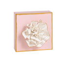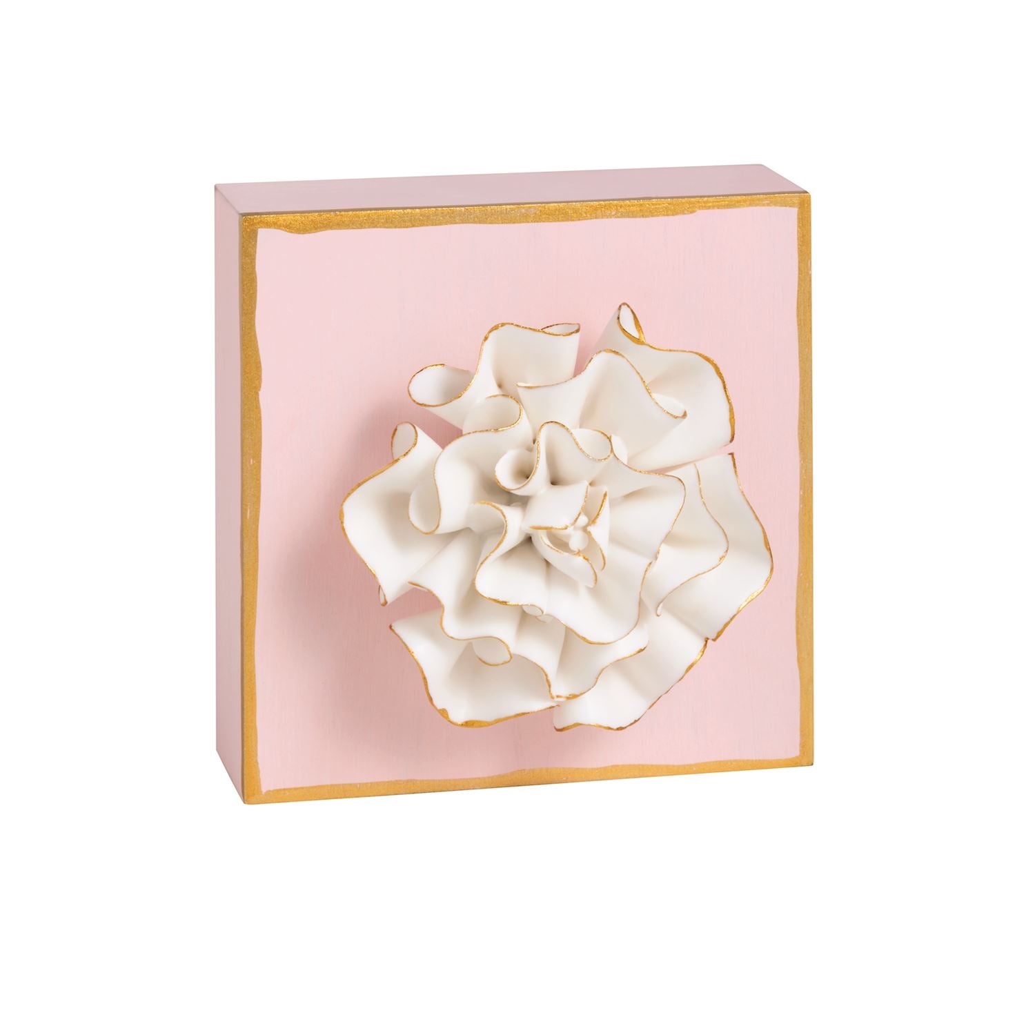 Hand-painted wooden block features dimensional plaster life-like flower.