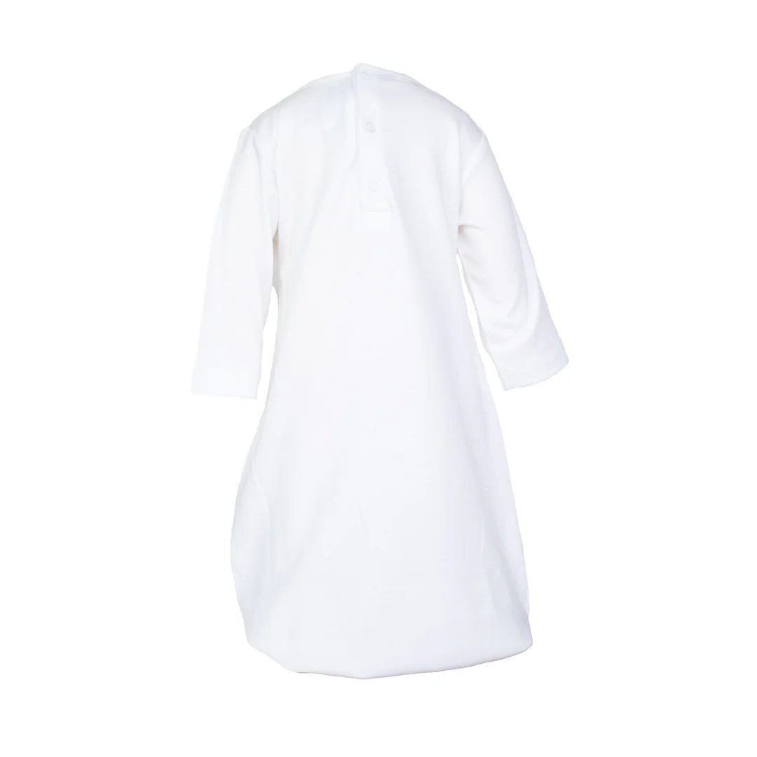 Buttery soft long sleeve gown in white jersey fabric with an intricately hand embroidered design. The perfect gown for sensitive newborn skin.