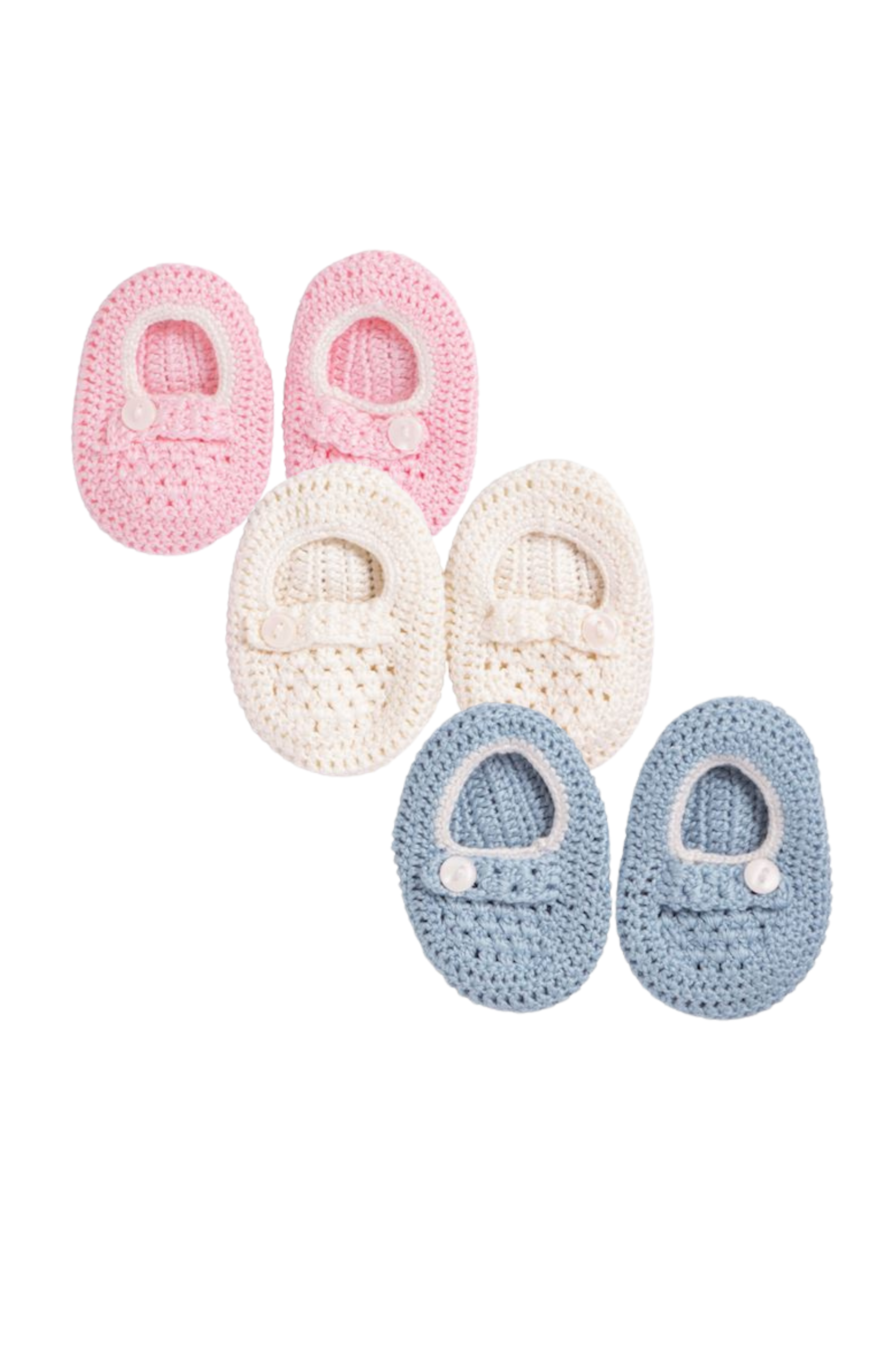 Crochet knit baby booties with button detail.