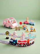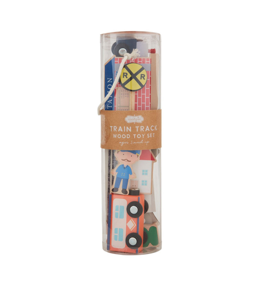 10-piece set includes three wooden train cars with magnetic connectors, train station, road sign, two trees, conductor, tree house and track. Ages 3+.