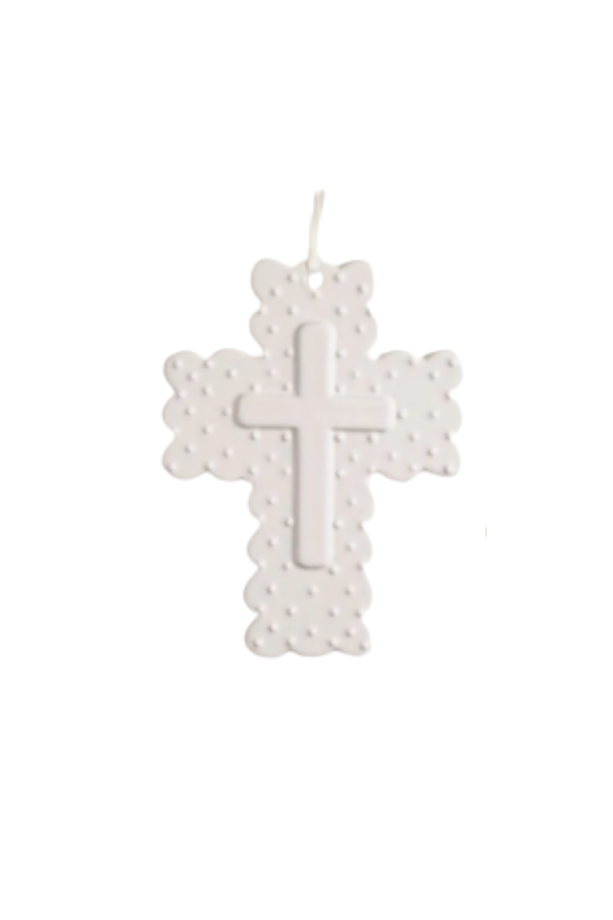 Hand-painted layered ceramic cross with scalloped edge and hat ribbon hanger
