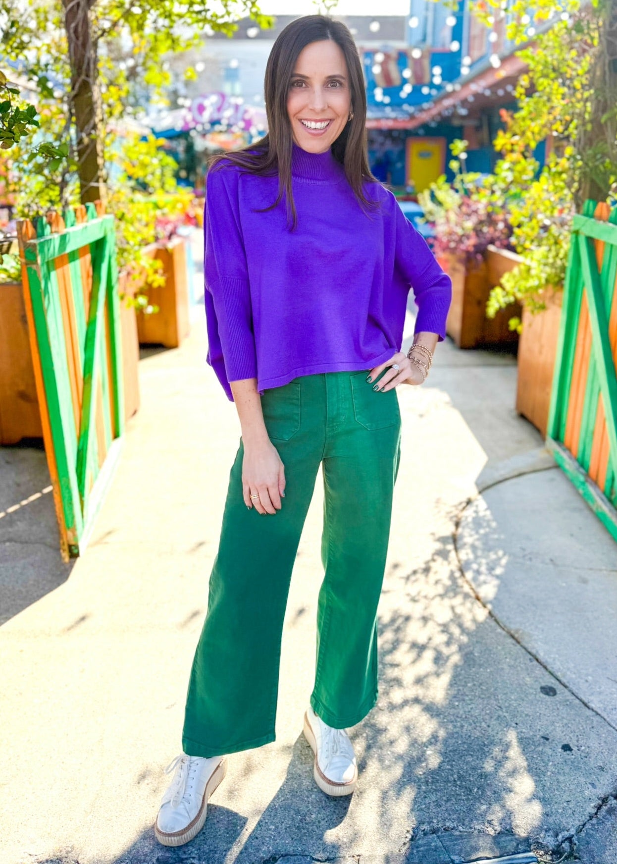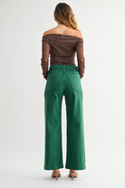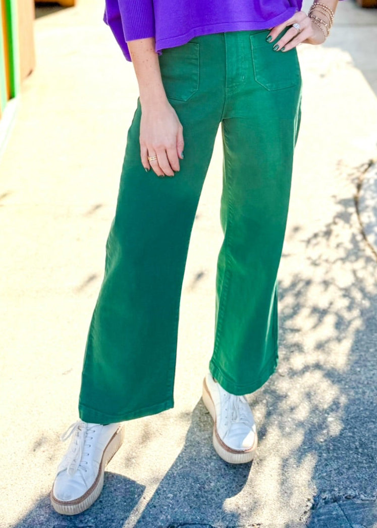 In a fresh shade of green, these high rise jeans feature a relaxed, wide-leg silhouette that brings effortless style. Patch pockets add a touch of utility and a standout, individual feel. 12" RISE, 28" INSEAM, 10.5'' OPENING