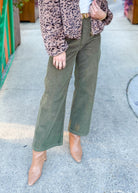 The wide leg that changes everything. Penny sits at a high rise with an ultra wide leg silhouette and cropped 27" inseam. The relaxed wide leg flows beautifully while the high rise anchors the proportions perfectly. Crafted from our comfort stretch fabric in Sequoia, a deep olive green tone.