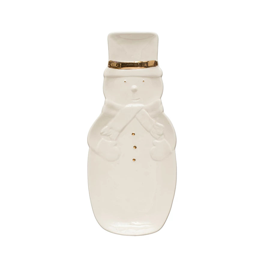 12"L x 5-1/4"W Debossed Stoneware Snowman Plate w/ Gold Electroplating, White