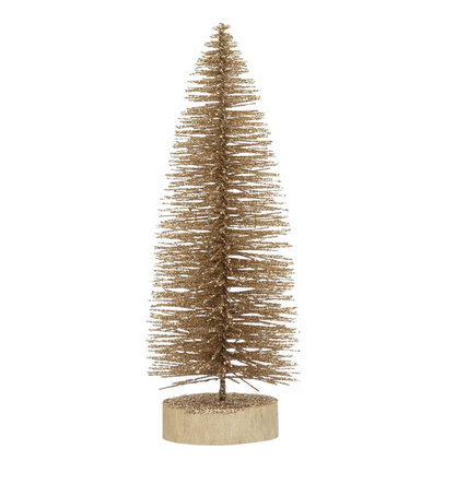 3-1/2" Round x 10-1/4"H Plastic Bottle Brush Tree with Glitter and Wood Base, Champagne Color