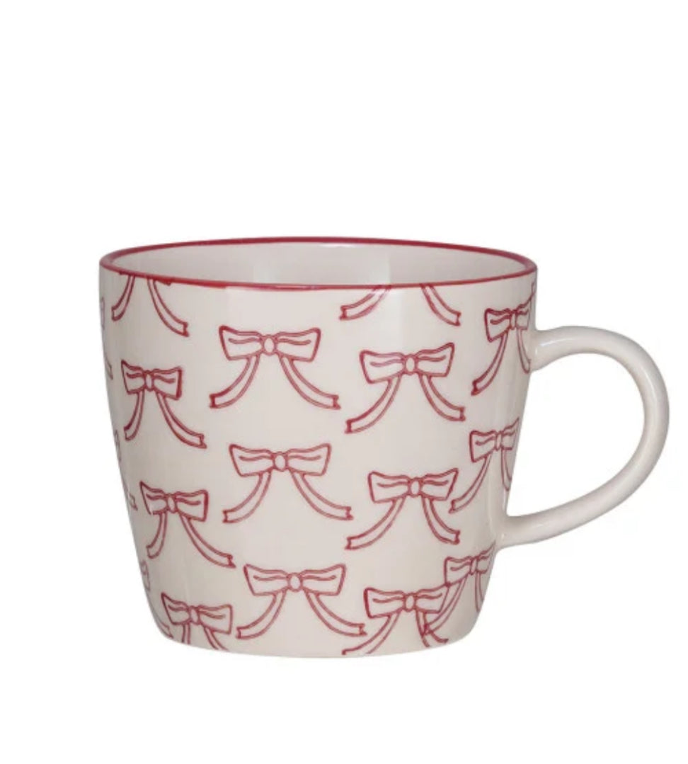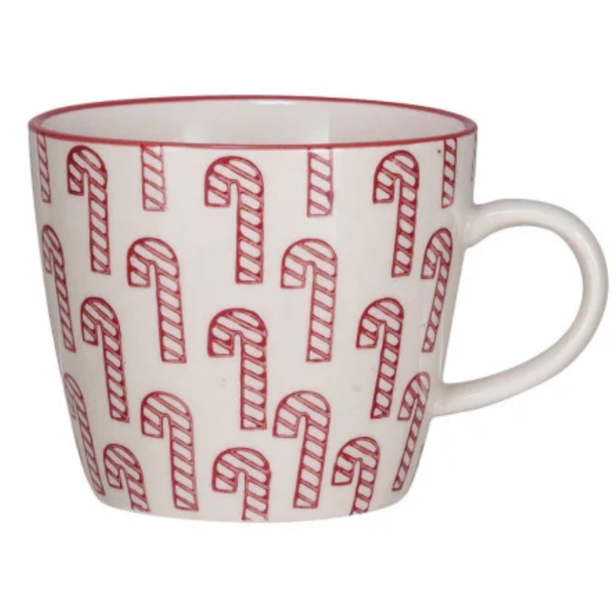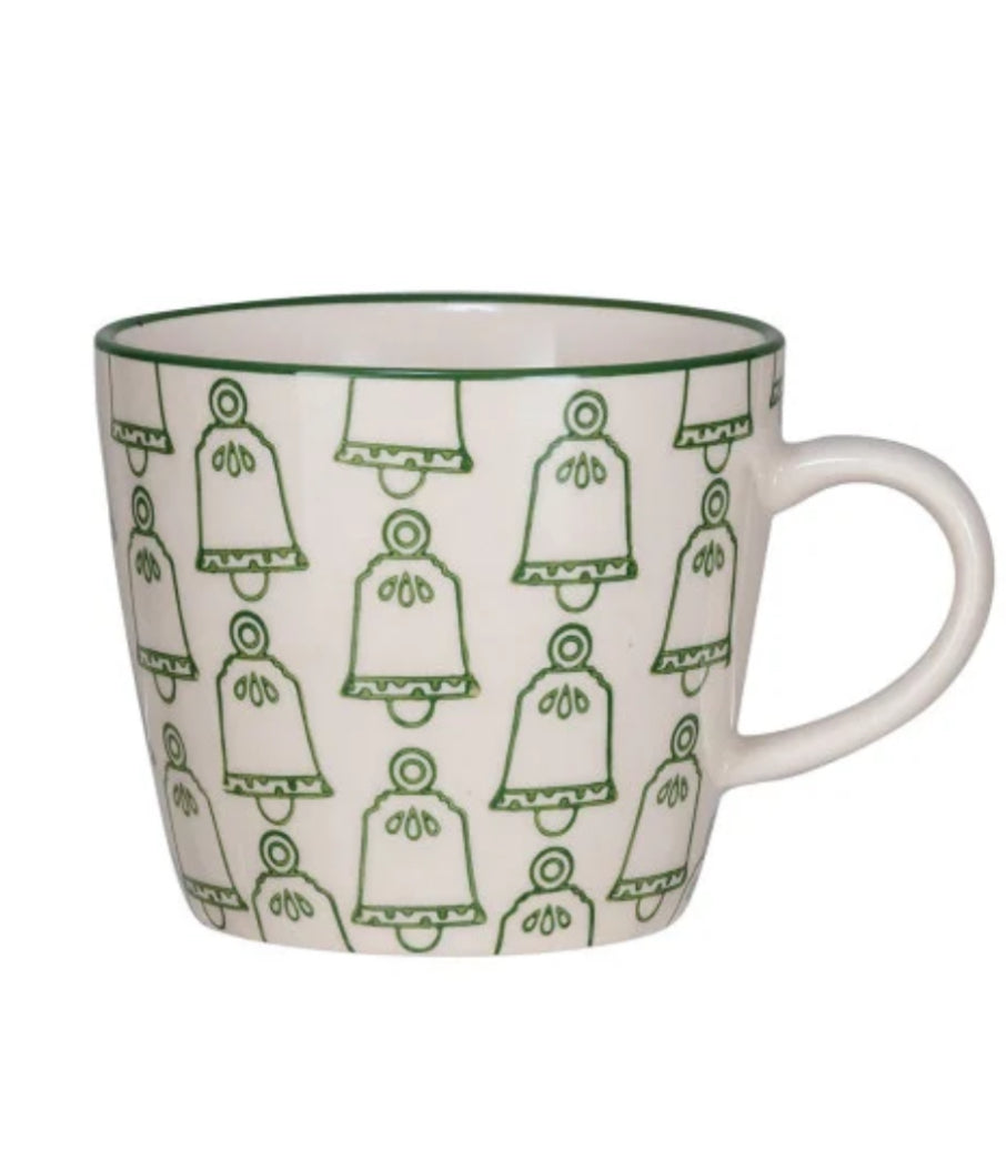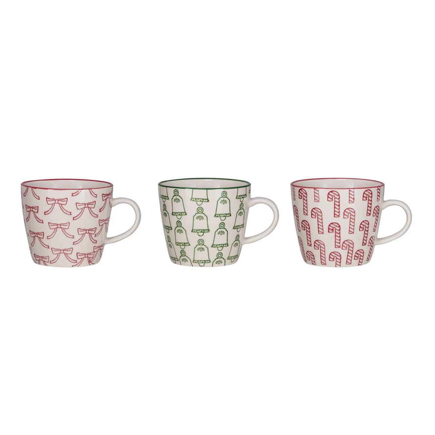 3 hand-stamped stoneware mugs with holiday patterns is a festive and cozy way to enjoy drinks and celebrate the season. The mugs come in three styles, each featuring a different hand-stamped ribbon, bell, and candy cane pattern in cream and green and green and red color. The mugs are made of pure stoneware with a glossy finish and smooth texture. They measure 3.75 inches in diameter and 3.25 inches in height, with a capacity of 10 ounces. They can be used for serving hot or cold beverages, or as a decorative piece. These mugs are perfect for seasonal dining and entertaining or as a thoughtful gift for loved ones. A festive and cozy set of 3 stoneware mugs that feature a hand-stamped holiday pattern in multicolor and round shape. A perfect choice for seasonal dining, or a thoughtful gift for loved ones. This set of mugs can be used for serving hot or cold beverages, such as coffee, tea, cocoa, or cider, or as a decorative piece on the table or shelf.