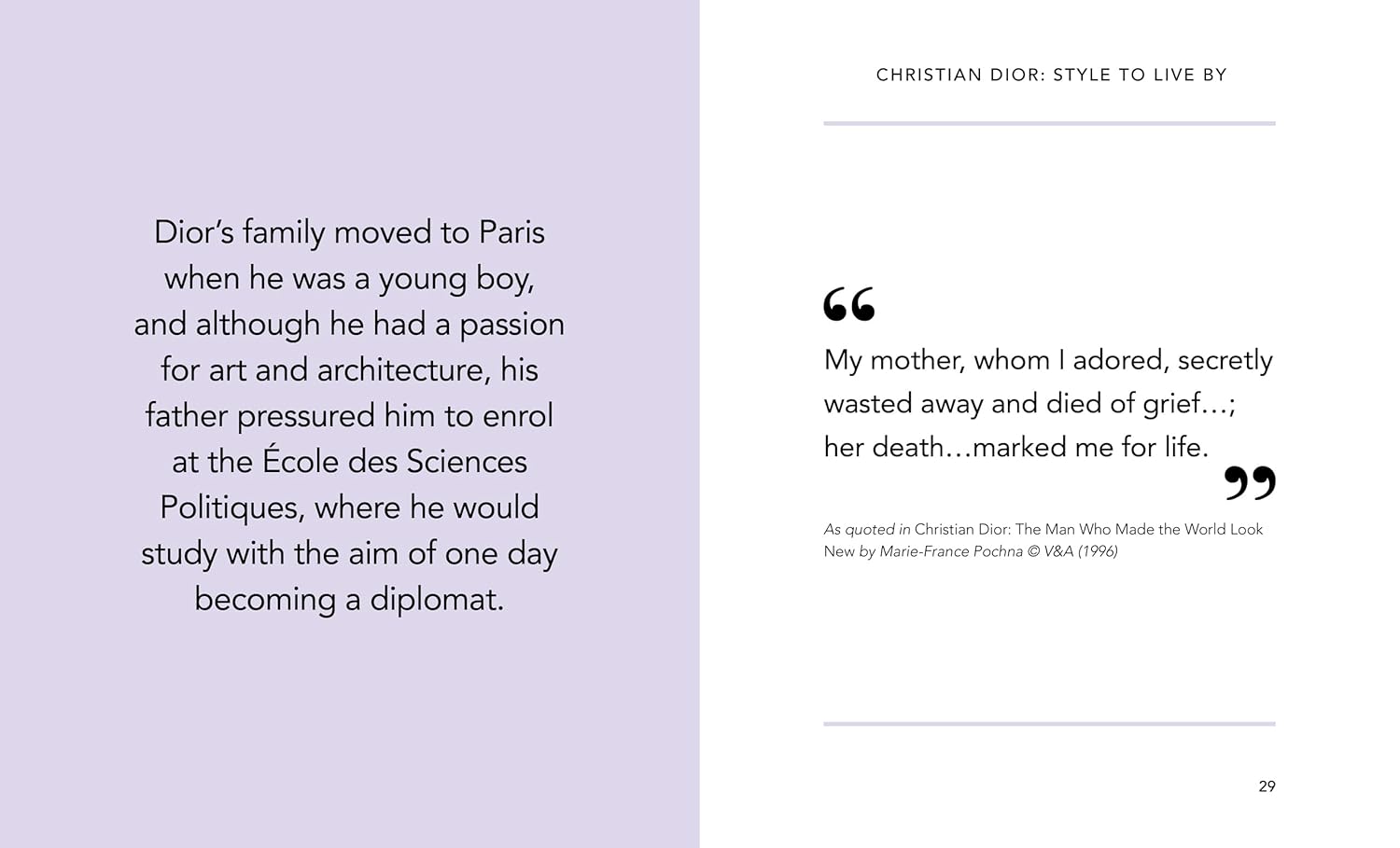 The Little Guide to Christian Dior shows how despite coming from a wealthy background with powerful allies, Christian Dior may not have had to scrap his way to the top as Coco Chanel did, but his talent is no less worthy and his legacy as one of the world's greatest designers is no less deserving.