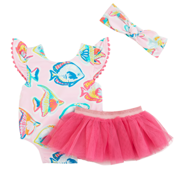 The Girls' Fish Reversible Swimsuit Set is a practical and stylish addition to your child's swimwear collection. This set includes a reversible one-piece swimsuit made of nylon spandex, featuring flutter sleeves with pom trim for added charm. The swimsuit also has inner leg snaps for easy diaper changes. The set also comes with a mesh ruffle tutu, adding a playful touch to the outfit. With UPF50+ protection, this swimsuit set ensures your child stays safe from harmful sun rays. The set is easy to care for, as it can be machine washed with like colors and line dried. The swimsuit and headband are made of 82% polyester and 18% spandex, while the tutu is made of 100% polyester.