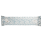 Cotton table runner features embroidered bunnies and ruffle edges.
