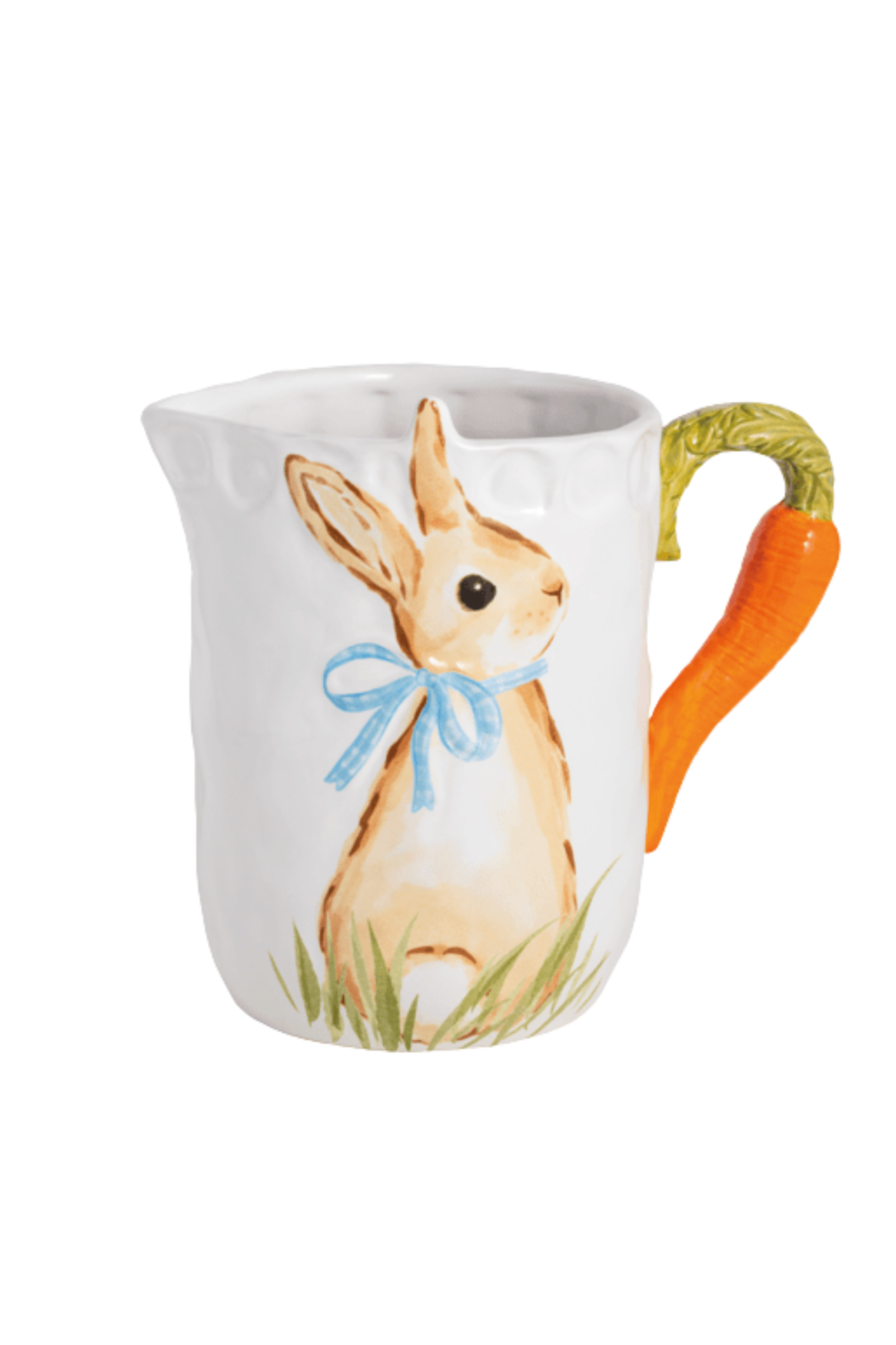Glazed stoneware pitcher with hand-painted carrot handle.