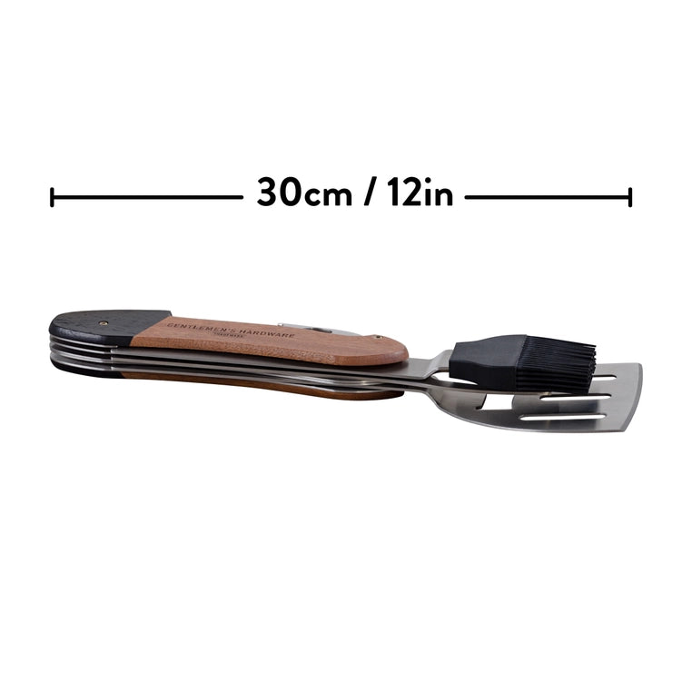 BBQ Multi-Tool with multiple uses including spatula, bottle opener and corkscrew. Wood handle and stainless steel finish.