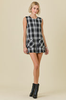 Sleeveless round neck, plaid tweed romper with front pockets