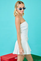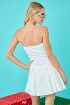 Strapless, drop waist, denim mini dress with pleats and belt
