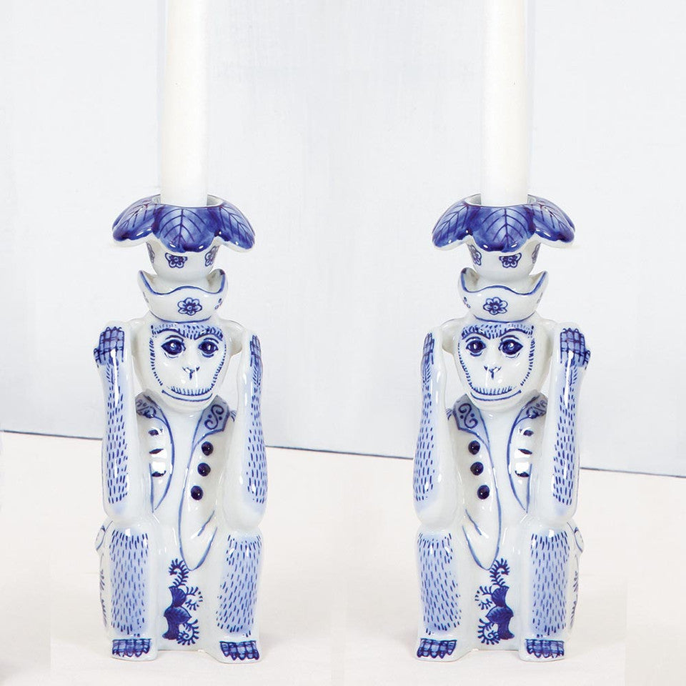 Introduce a timeless, yet classic touch to your home with the Blue Chinoiserie Monkey Candlestick Set. Crafted to perfection in porcelain, this beautiful piece of decor provides a touch of elegance to any room setting. Inspired by French chinoiserie and featuring two candlesticks per set, each with a dimension of 9" x 3.5" x 3", you can bring luxurious and eye-catching style into any home interior. Perfect for displaying on their own or paired up with other chinoiserie pieces for an elevated look, these candlesticks bring unparalleled sophistication wherever it is placed. Spot clean or dust for the best care maintenance - the perfect combination of easy maintenance and timeless decor. Get yours today and hear no evil!