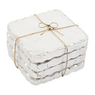 Set of four white marble coasters feature textured raw edge with silver or gold foil finish. Arrive stacked and tied with twine.