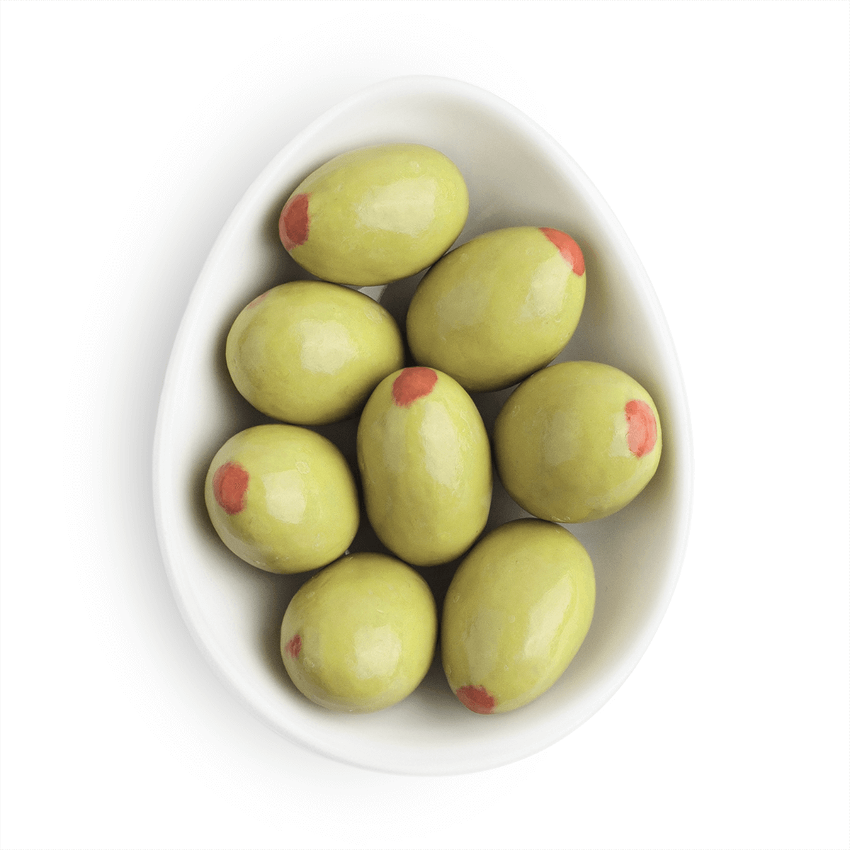 Don't worry, there aren't any actual olives in this candy... just smartly-dressed, chocolate-covered almonds masquerading as cocktail garnishes. A fresh-roasted California almond is dipped in creamy white chocolate, then painted to resemble a martini olive. The perfect gift for martini lovers!