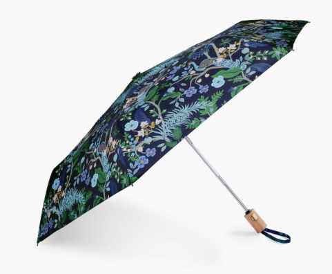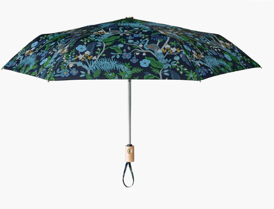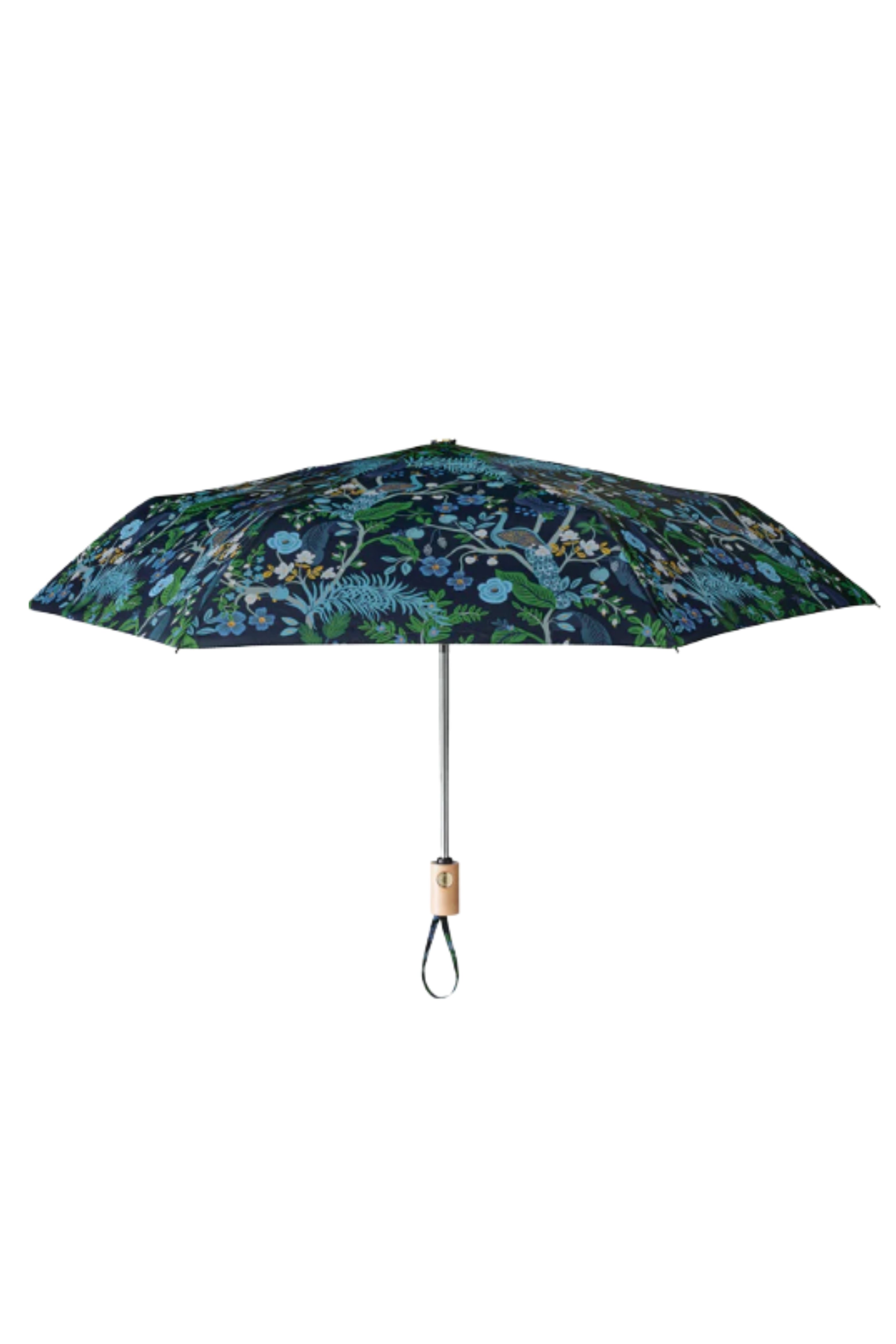 • No rainy day blues here. Our Peacock umbrella features a wooden handle, a patterned sleeve, and an auto open/close function.