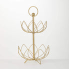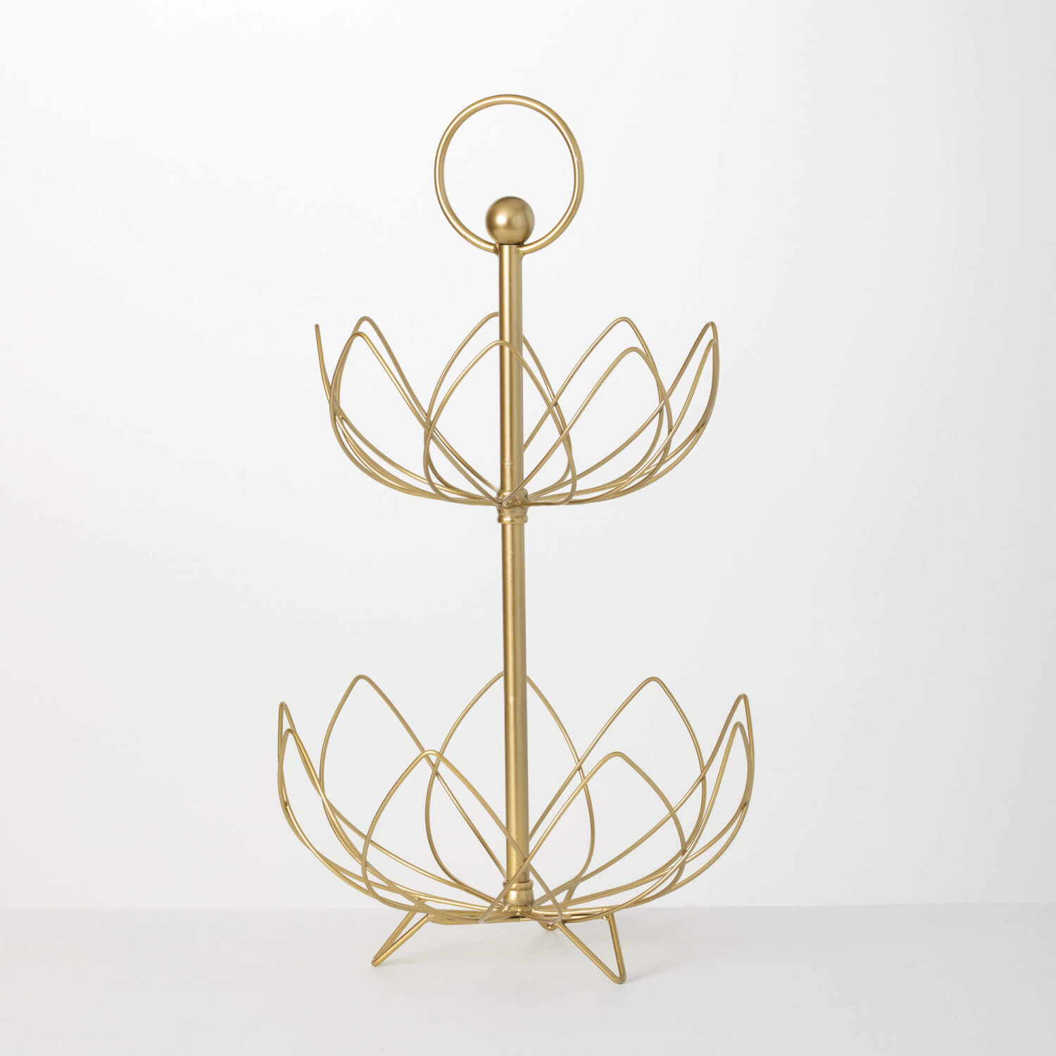 Bringing a shapely decorative accent to your countertop, this open wire footed display really shines with its brushed gold finish. The two-tiered, 24" tall design of this piece gives you ample space to store fruits, vegetables, or ornamental objects.