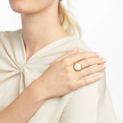 Two rings in one! A glistening gemstone of mother of pearl on one side and on the other side a gold coin of a knight on horseback with a CZ sparkle in the horse’s eye.