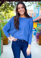 Boat neck top with 3/4 length dolman sleeves and curved sweep.