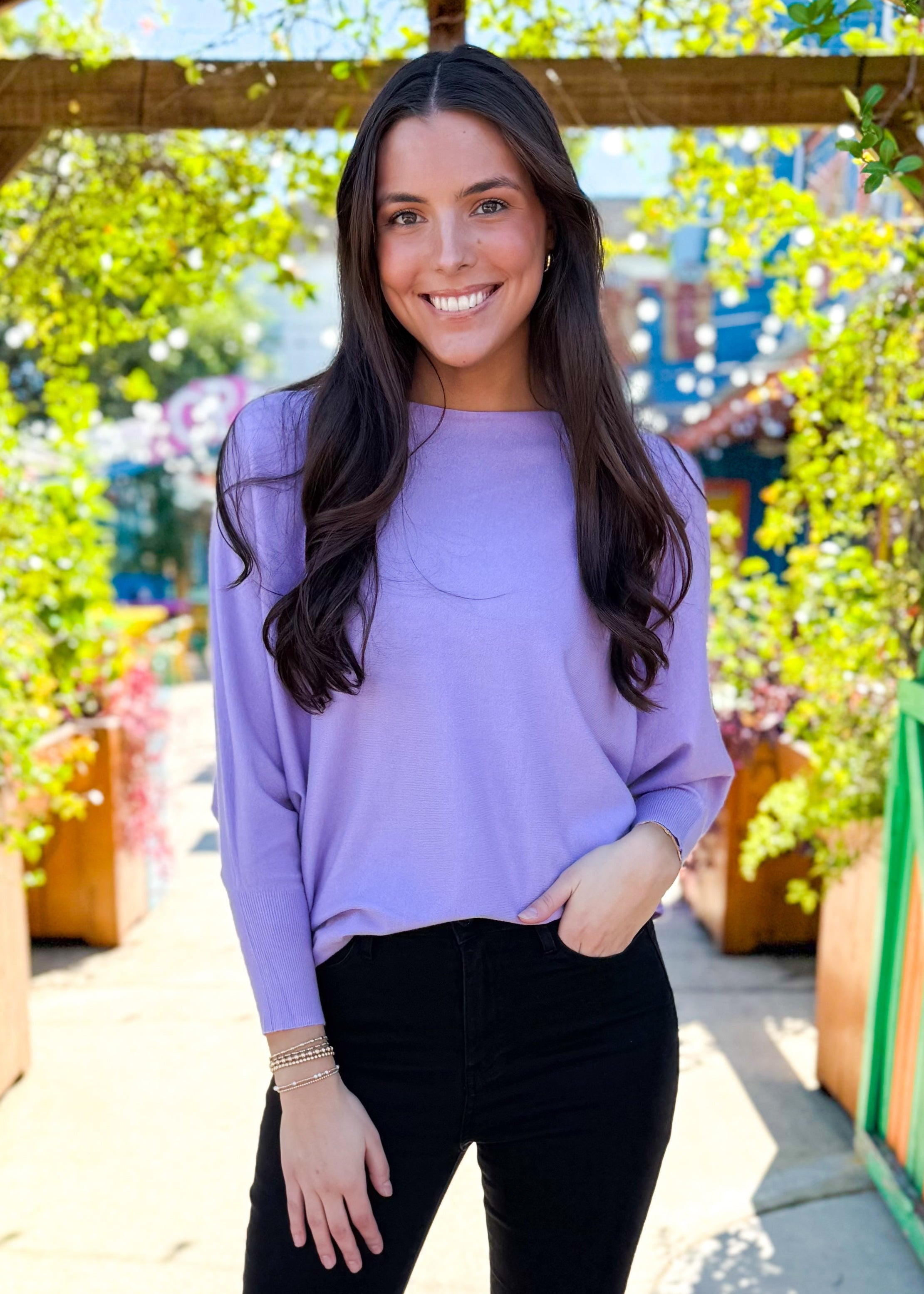 Boat neck top with 3/4 length dolman sleeves and curved sweep.
