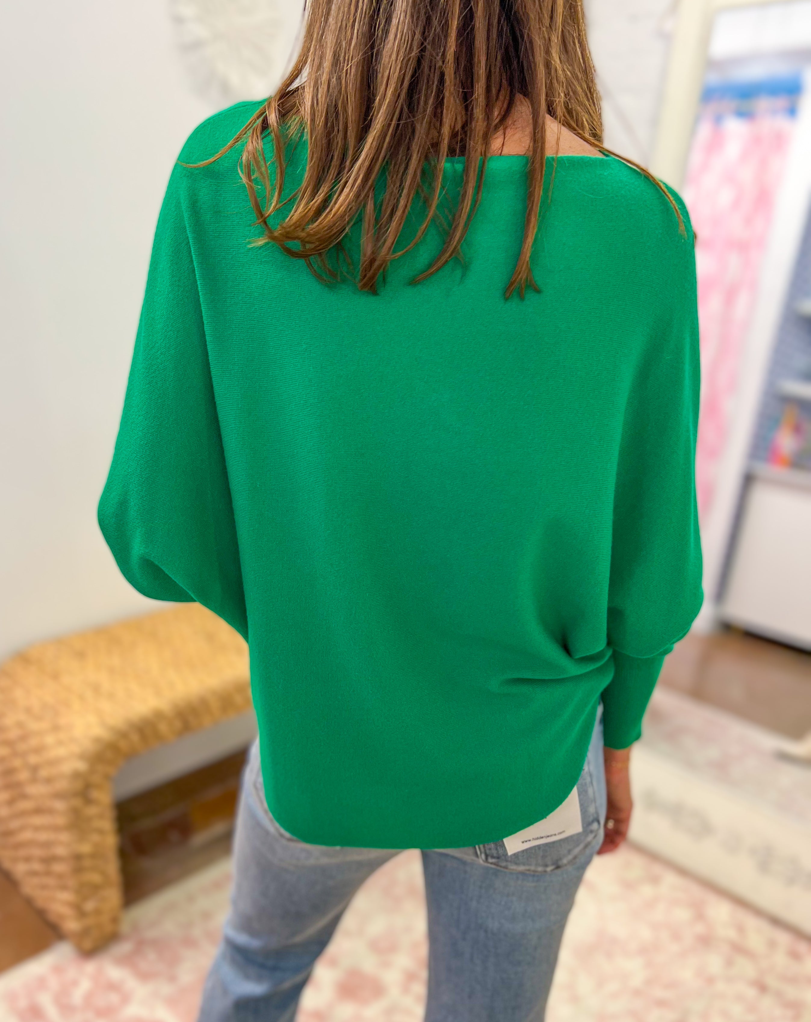 Boat neck top with 3/4 length dolman sleeves and curved sweep.