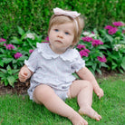 Girls' ruffled peter pan collar short sleeve pima bubble. Button closure in back and three snaps in the stride. Made from 100% Peruvian Cotton.