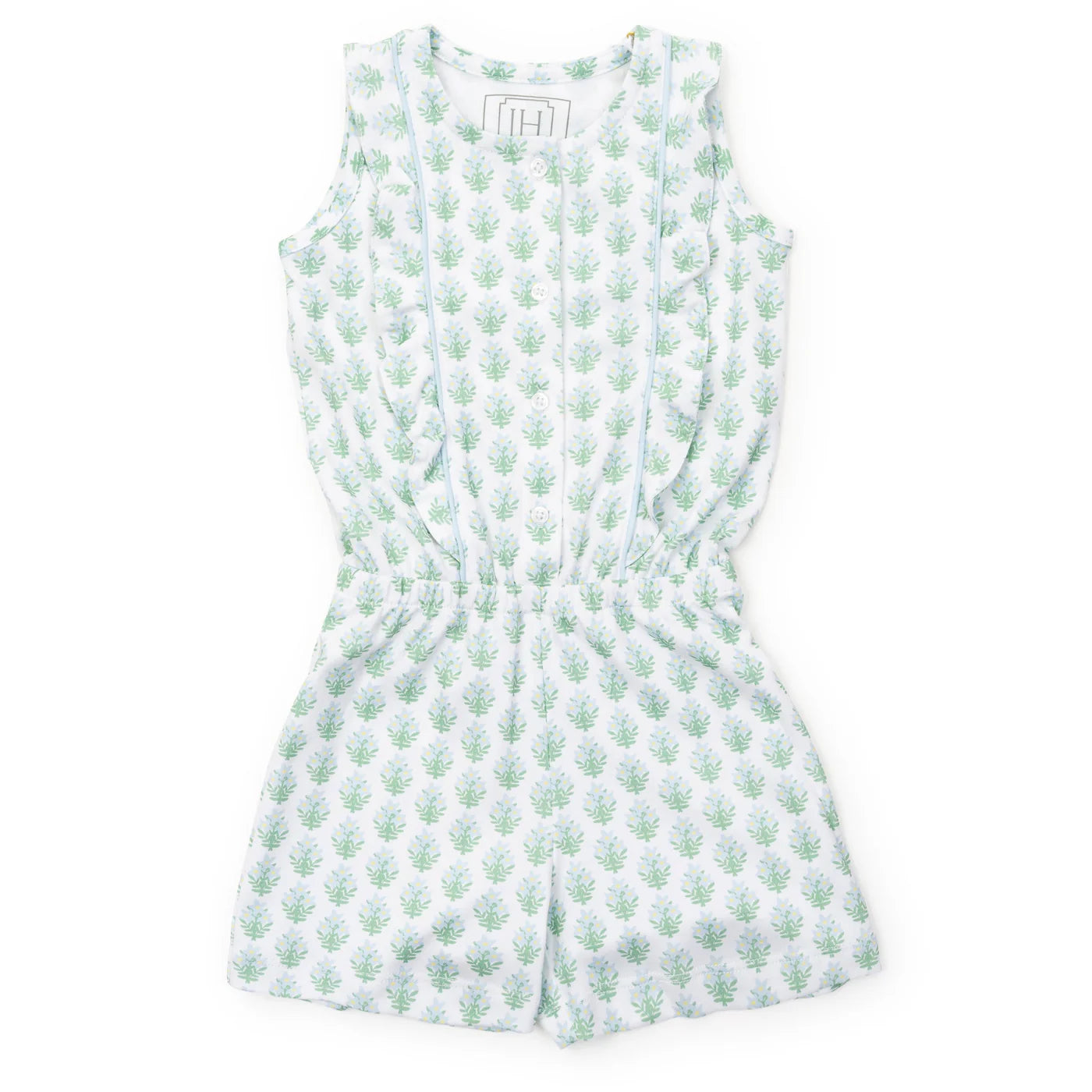Girls' sleeveless pima cotton romper with ruffle detail down the front. Romper buttons down the front and has an elastic waistband.