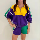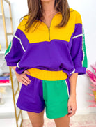 Mardi Gras Athletic Style Top Loose fit, true to size. 50% Polyester, 43% Cotton, 7% Spandex Designed in Nola