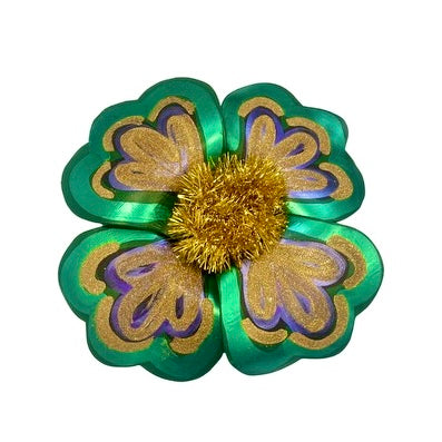 Locally designed and handcrafted; featuring hand painted petals of saturated emerald green and amethyst, with metallic highlights and pops of gold holographic glitter.