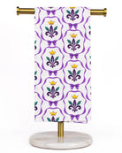 The Mardi Bow Hand Towel is a vibrant addition to your holiday or party decor. Measuring 20x28 inches, this white towel with multi-colored accents brings festive cheer and a playful touch to any bathroom or kitchen for Mardi Gras celebrations.