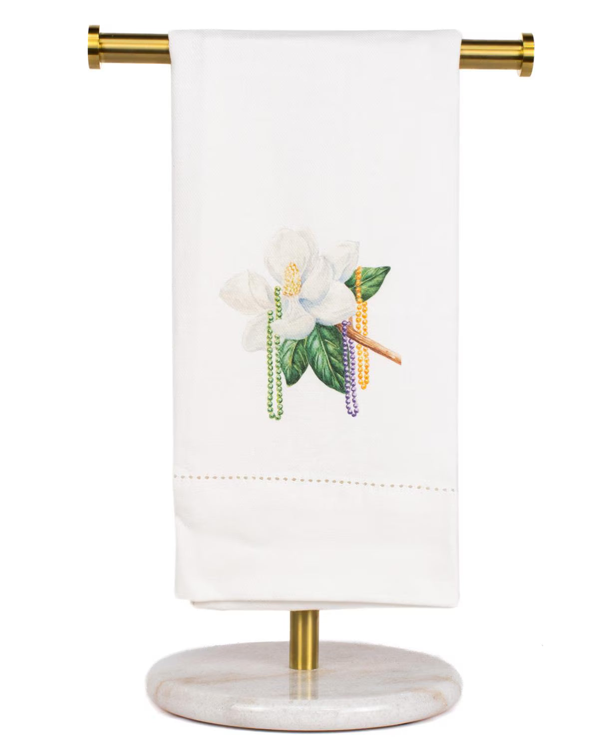 Celebrate Mardi Gras in style with the "Mardi Magnolia" hemstitch hand towel. Designed with a fresh white backdrop and vibrant multi-colored accents, this towel combines festive charm and elegance, making it the perfect addition to your seasonal decor.