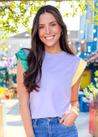 Fitted, most size up. Mardi Gras inspired white blouse Pastel lavender, green, and yellow pearls. Flutter Cap Sleeve. Designed & Printed in NOLA