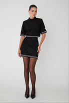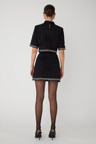 The Zoe set includes two pieces: a mock neck top and an A-line skirt. Both feature silver stud accents along the hems and sleeves, enhancing their elegant silhouette. Crafted from ultra-soft, stretchy black faux suede, this ensemble combines comfort with a refined glamour highlighted by the silver detailing. Sold as a coordinated set.size chart