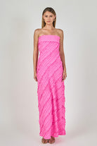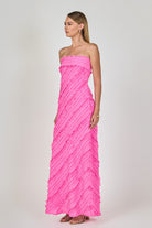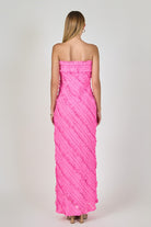 Pleated chiffon, bias cut maxi dress with ruffle detail. Strapless with hidden side zipper. Full lined.