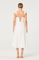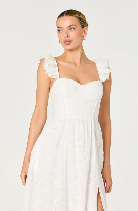 Romantic embroidered eyelet fabric and delicate ruffle straps give this corset dress timeless appeal. The fitted bodice features sewn-in boning and underwire cups for support, while the lace-up back and front slit create an alluring silhouette.