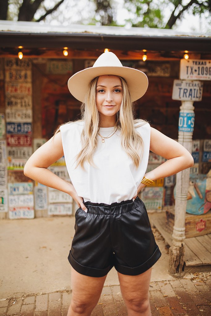 Are you obsessed with these shorts as much as we are? We would worry if you weren't! Our Peyton Shorts are a fall must have! She features an elastic band with scrunched detailing, vegan leather material, zipper and front snap closure, and a cuffed hem! Pair her with any bodysuit and booties for the perfect fall look!