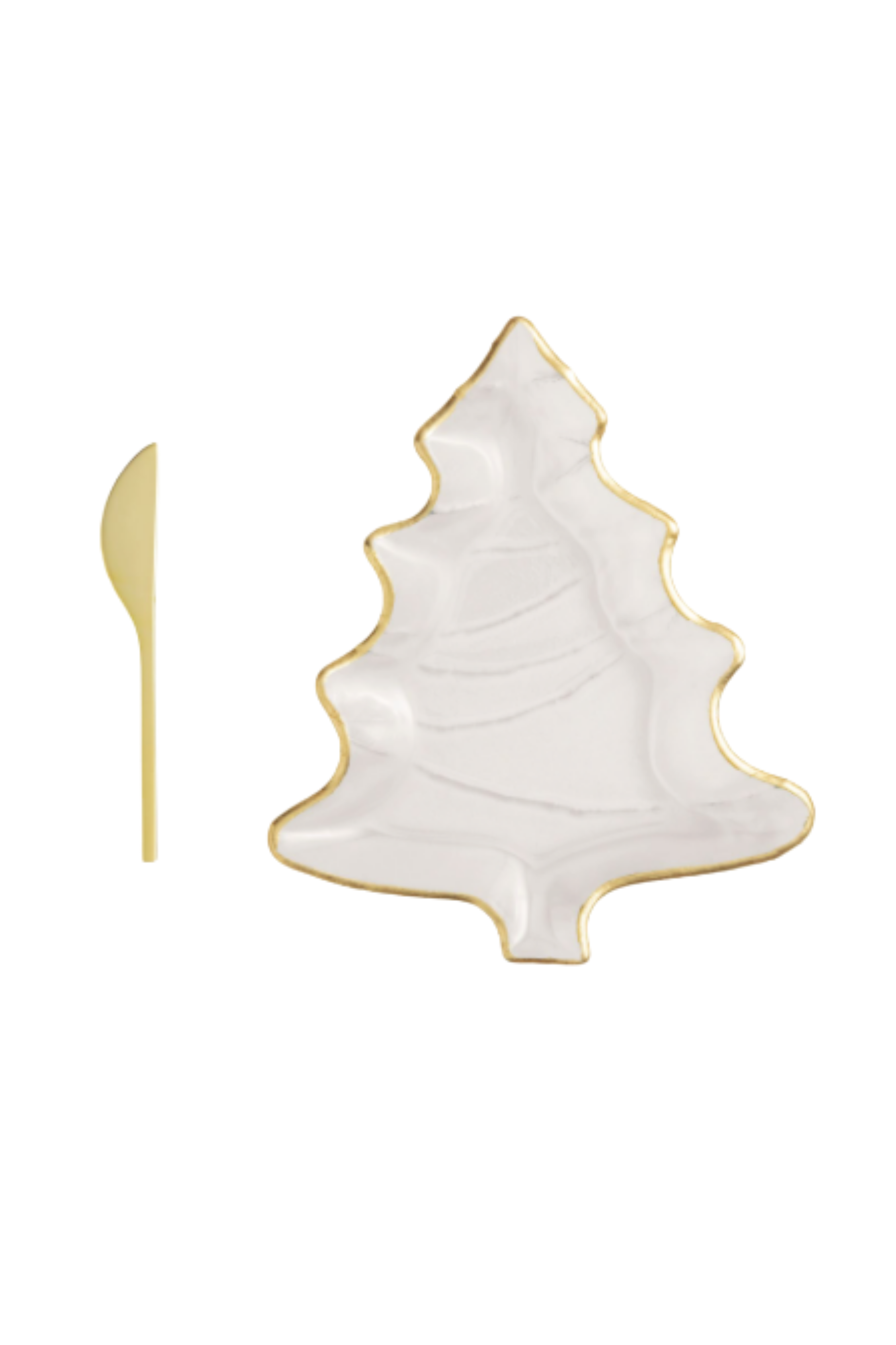 2-piece set. Fused glass plate features gold foil detail. Comes with gold stainless steel spreader.