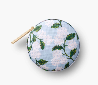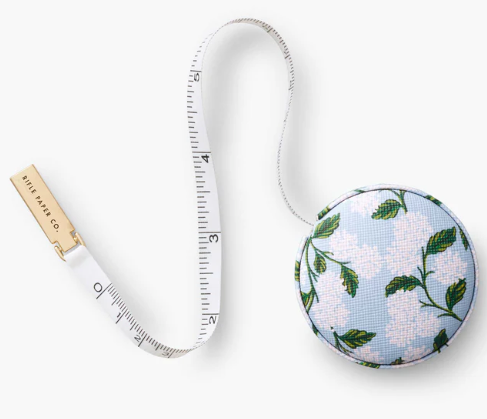 This retractable measuring tape is housed in an illustrated case with brass hardware and a hidden button release. Keep this handy tool in your sewing box, at your desk, or in your purse. The tape measures 60 inches or 152.4 centimeters.