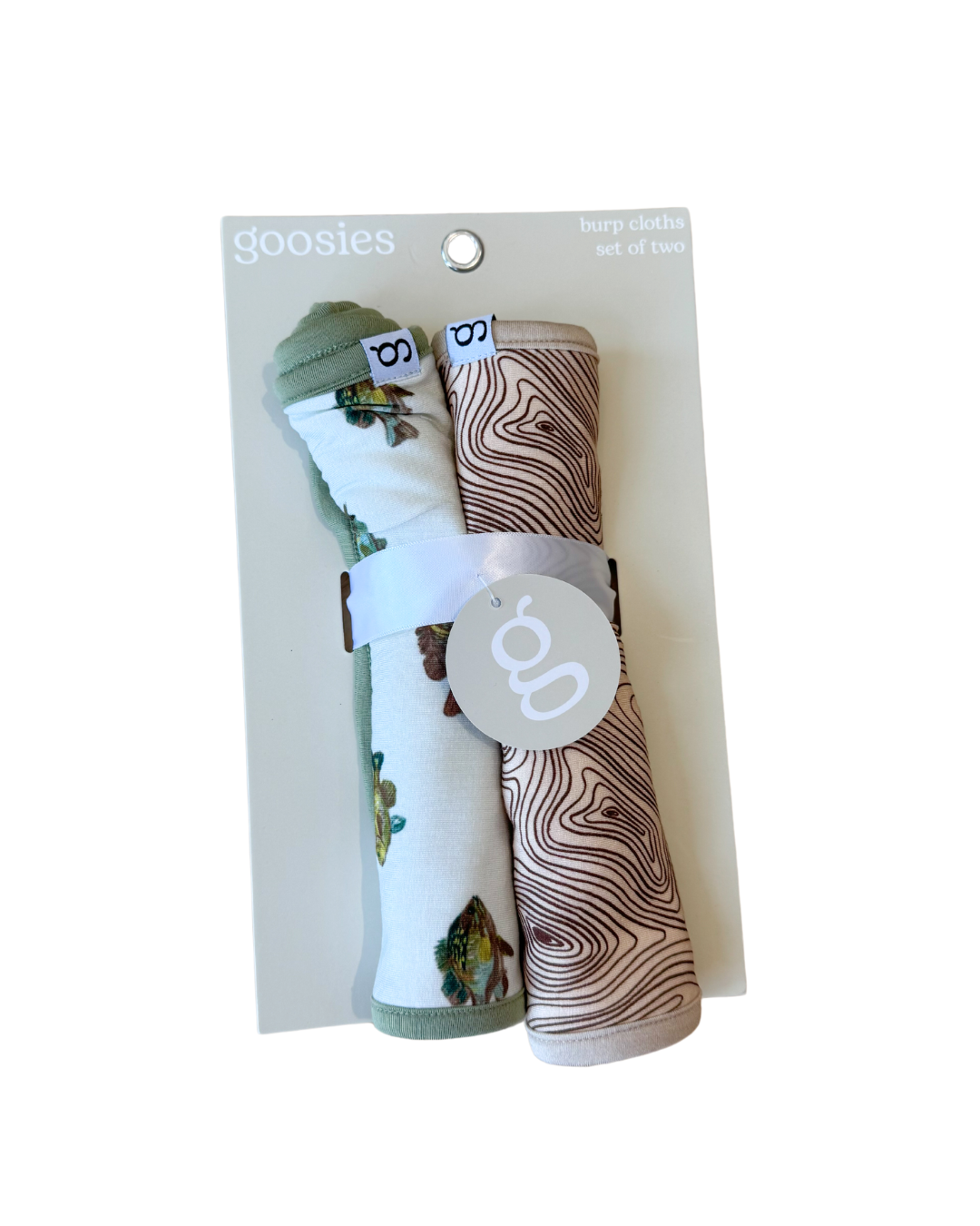 Set of Two Burp Cloths Front: 95% Bamboo, 5% Spandex Back: Terrycloth Machine wash cold on gentle cycle. Flat dry or tumble low.