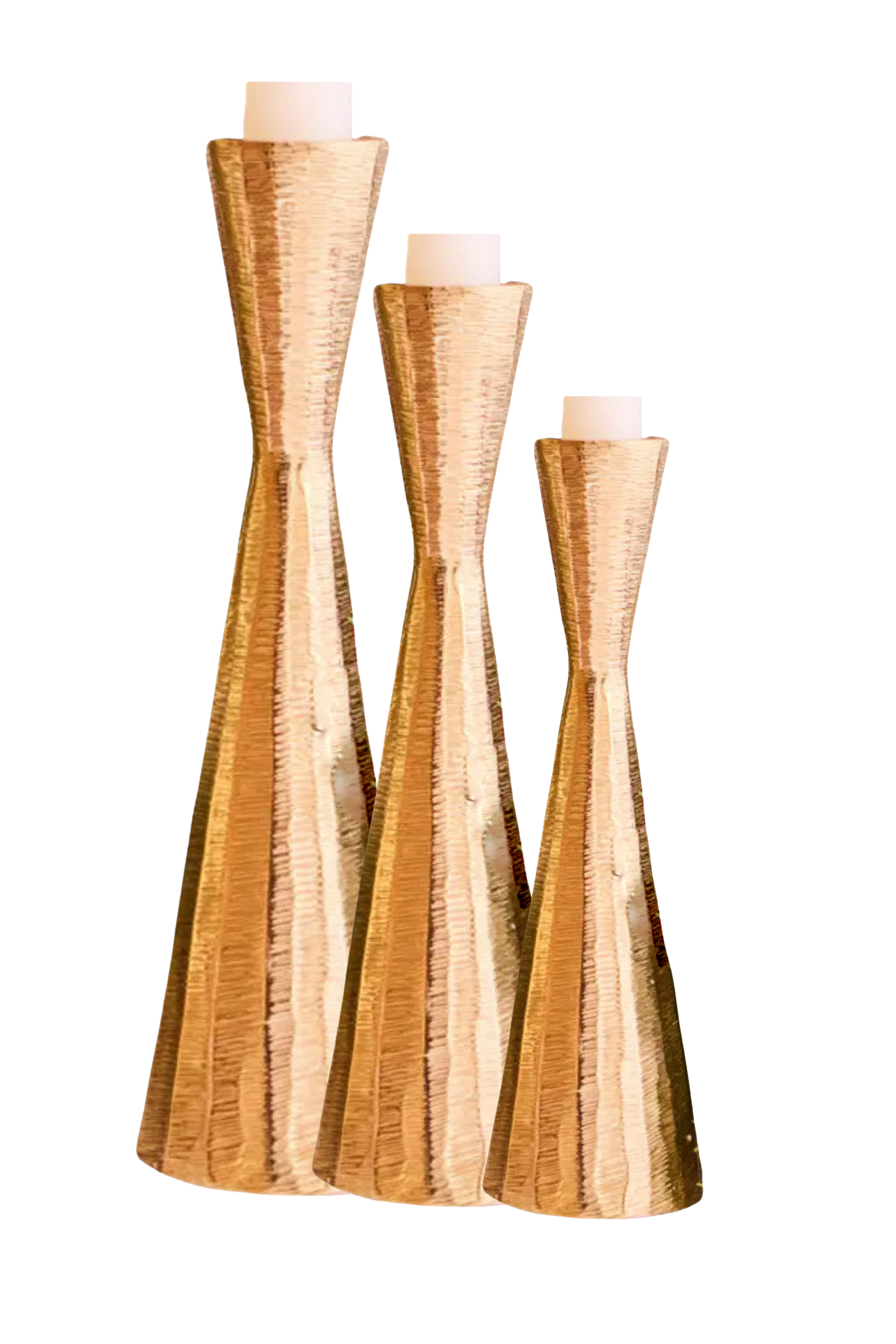 Add a touch of timeless elegance to your table or mantel with these stunning Gold Hammered Candle Holders. Featuring a modern hourglass silhouette and a beautifully textured finish, these metal holders bring warmth and sophistication to any space.