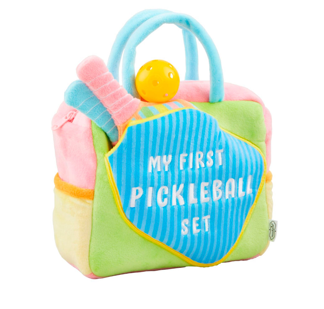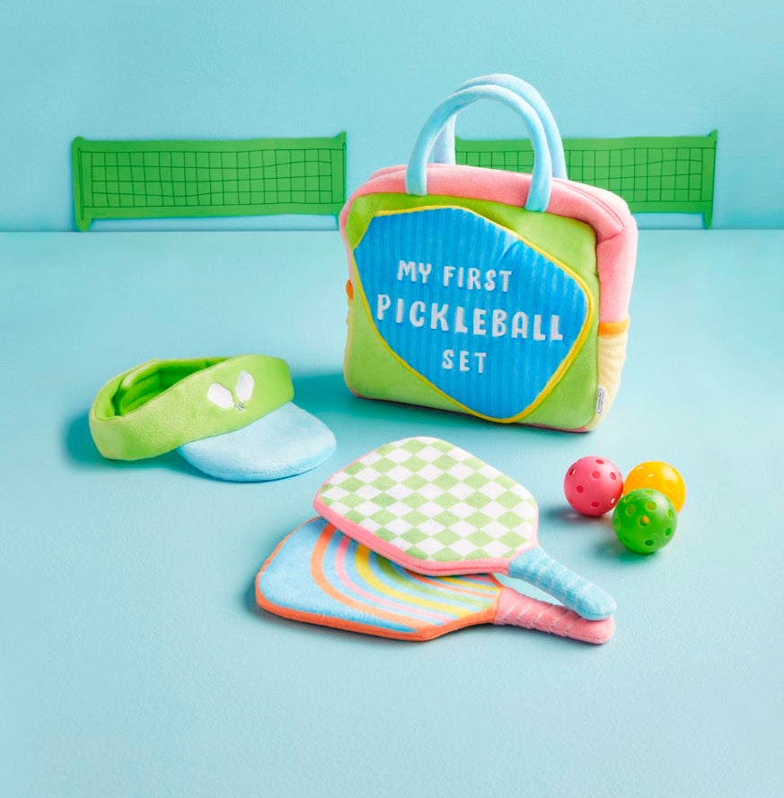 7-piece plush minky set includes: two paddles, three balls, visor and storage bag. Ages 18M+.