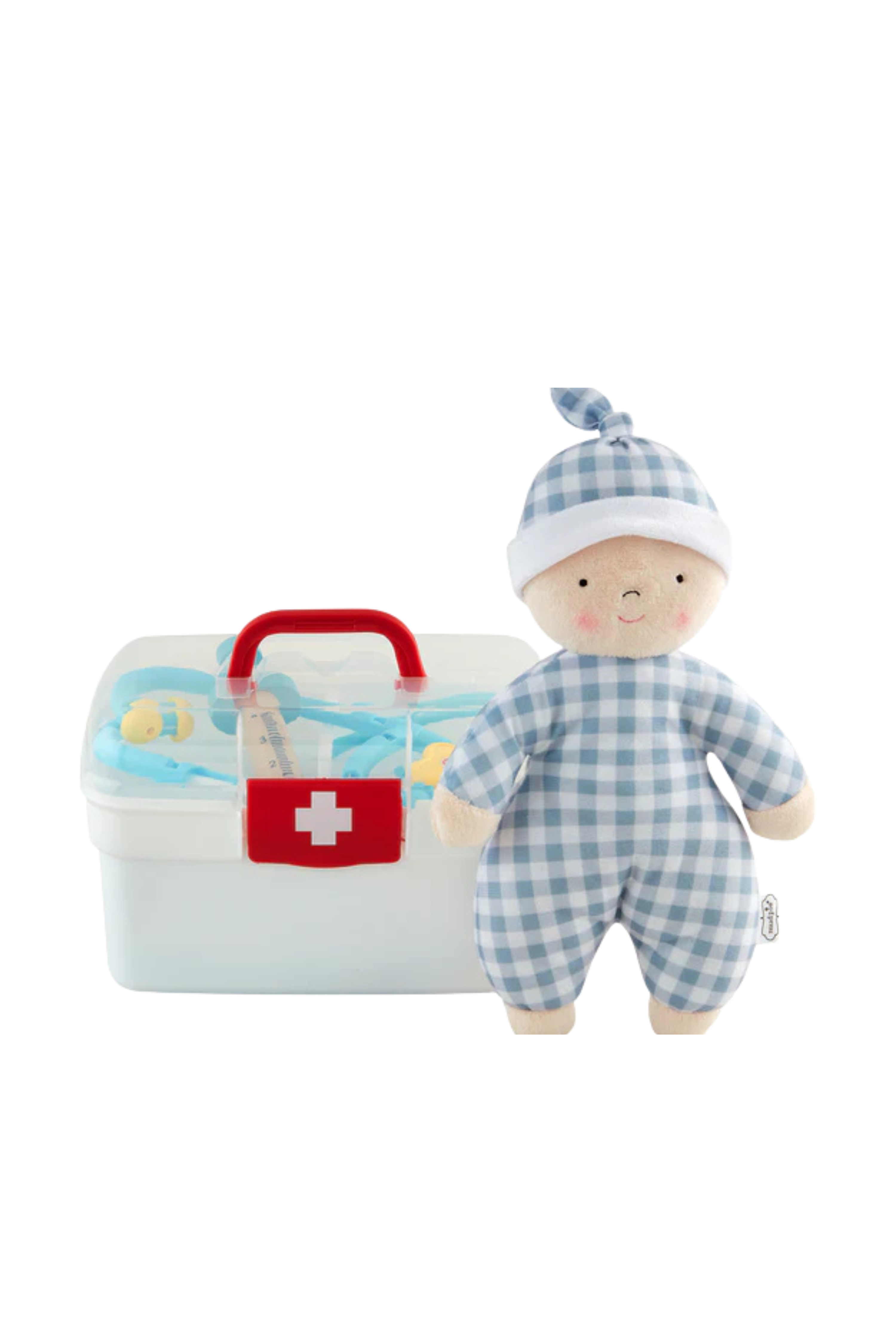 • 8-piece set features dress-up hat, plush baby doll patient, stethoscope with heartbeat sound, light up instrument and doctor's kit to hold all the necessary equipment. Batteries included. Ages 3+.