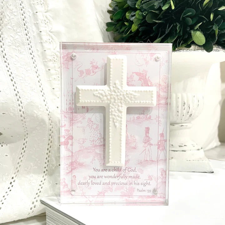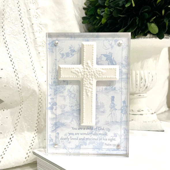 4” x 6” acrylic base with white plaster cross and toile backing in blue or pink. Packaged in a clear gift box.