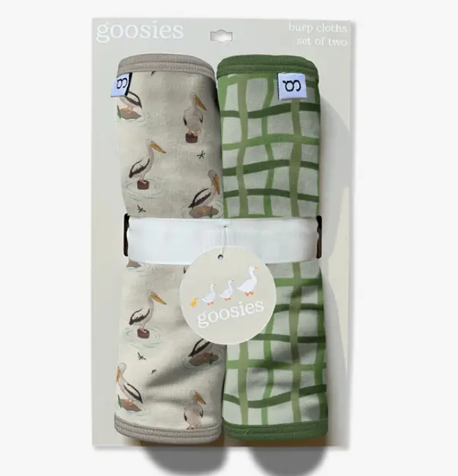 Set of Two Burp Cloths Front: 95% Bamboo, 5% Spandex Back: Terrycloth Machine wash cold on gentle cycle. Flat dry or tumble low.